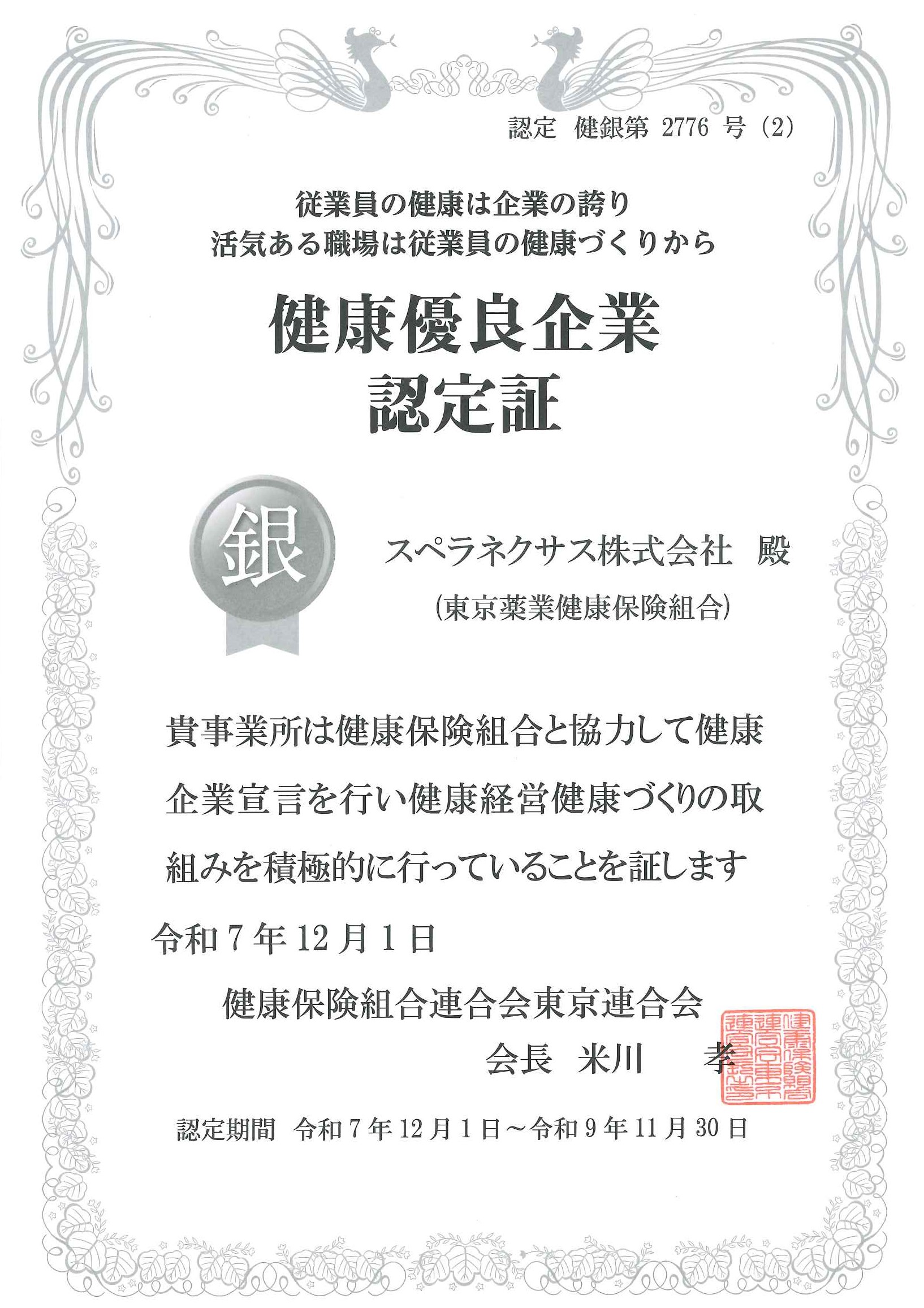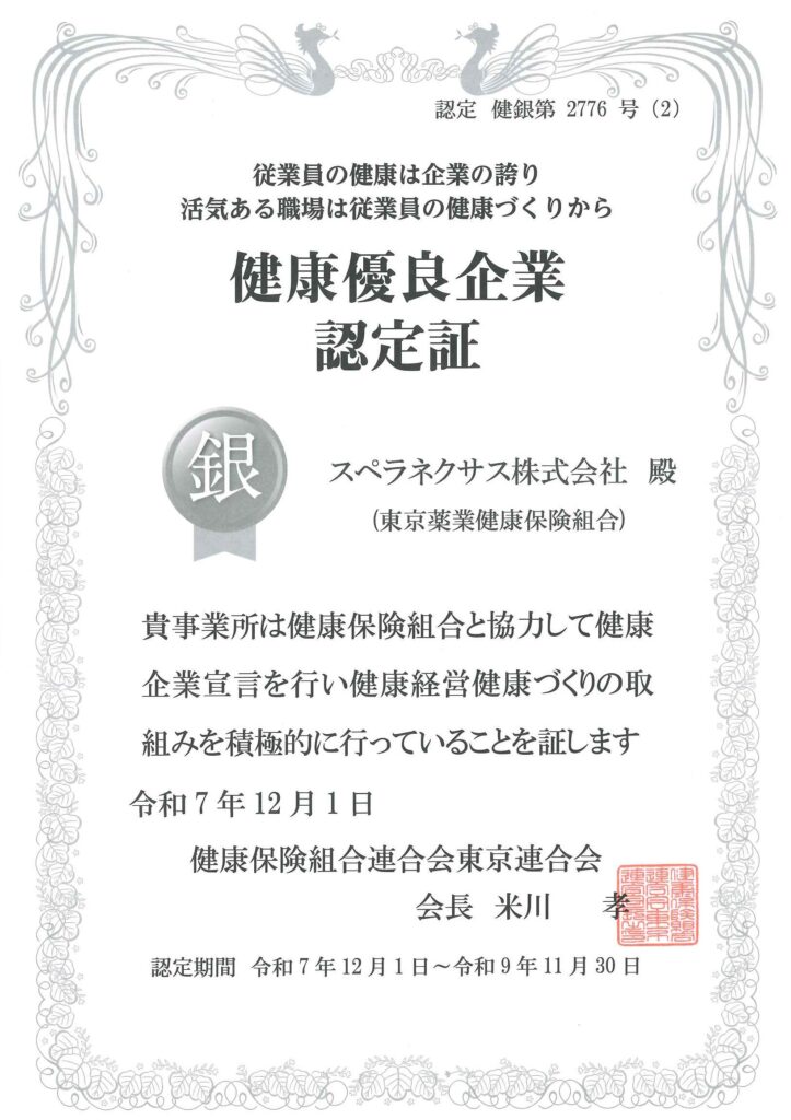 この度当社では健康保険組合連合会東京連合会に「健康企業宣言」を行い、健康経営健康づくりの取り組みを積極的に行っている企業として、2025年12月1日付で健康優良企業に認定され「銀の認定」を取得致しました(健銀第2776号)。